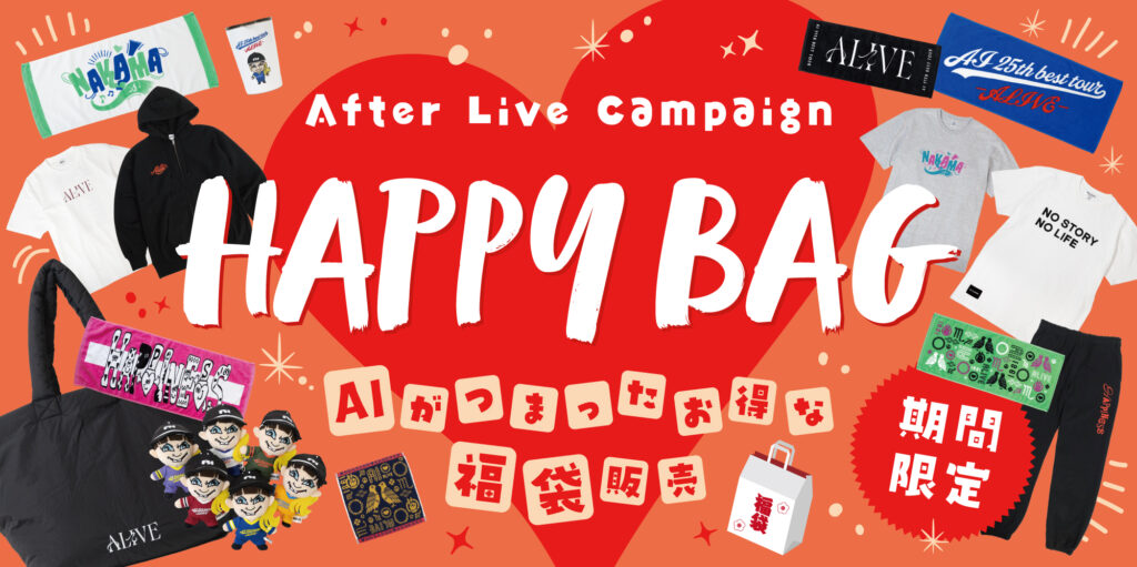 2025.12.262025.12.26AIがつまったお得な福袋『HAPPY BAG』販売決定!! ツアー会場で販売された人気グッズや、今では手に入らないアイテムを詰め込んだ期間限定の『HAPPY BAG』が登場!!オンライングリーティング抽選券付きの超レアBAGや、ここでしか手に入らないオリジナルアクスタ付きBAGもラインナップ! 何が入っているかは開けてからのお楽しみ。運も思い出も詰め込んだ、今だけのスペシャル企画をお見逃しなく!! 詳細はこちらhttps://www.ai-goods.shop/view/page/happybag2025