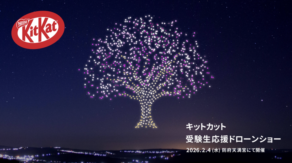 ・なお、ミニライブ・ドローンショーともに、「キットカット」公式 Instagram より視聴可能です。防府天満宮周辺では広域にわたってドローンショーを見ることが可能です。