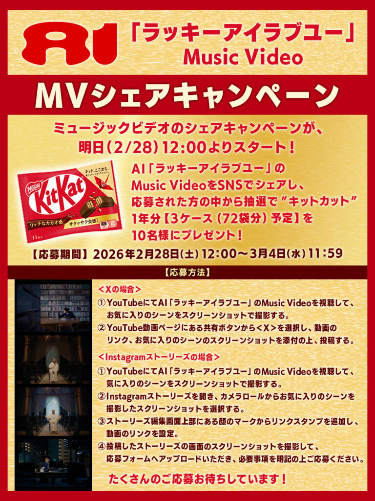 AI「ラッキーアイラブユー」のMusic VideoをSNSでシェアし、応募された方の中から抽選で”キットカット”1年分【3ケース(72袋分)】を10名様にプレゼント!