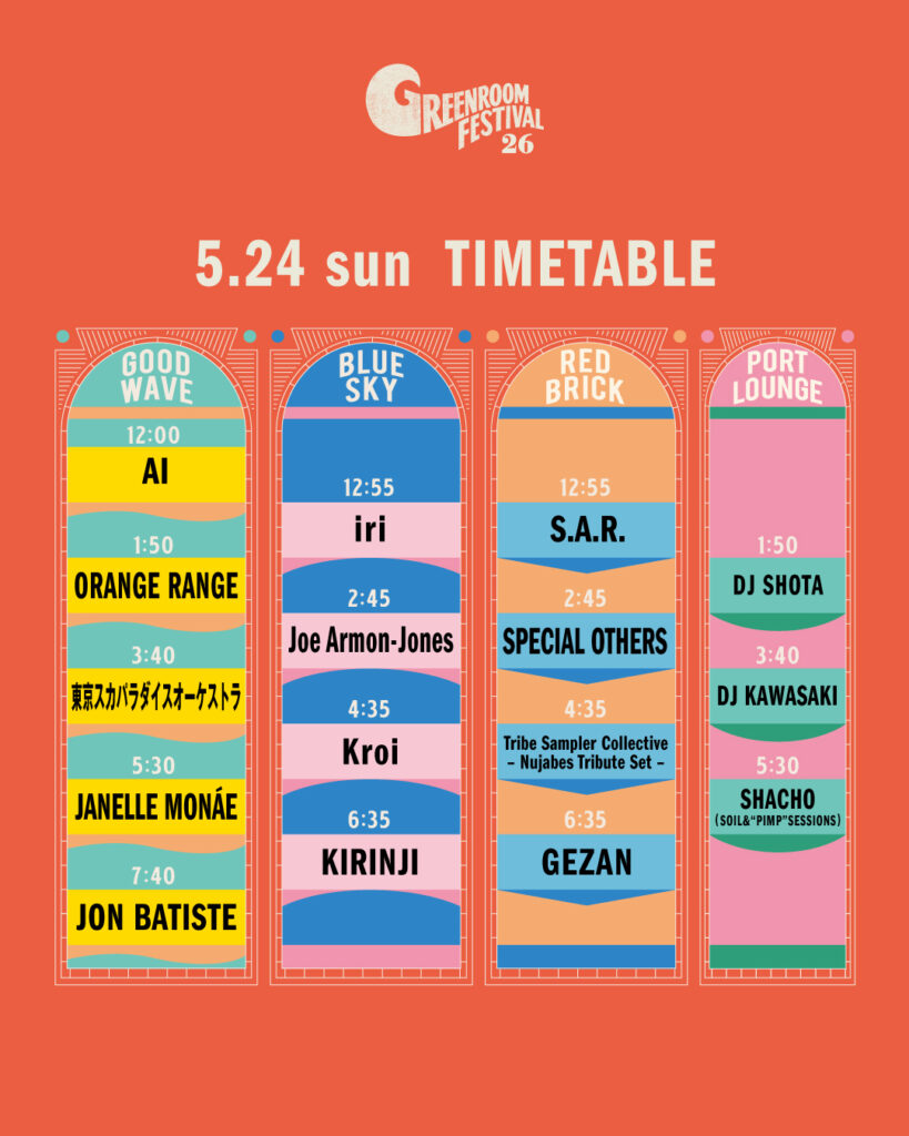 2026.04.095/24(日)「GREENROOM FESTIVAL’26」タイムテーブル解禁! 「GREENROOM FESTIVAL’26」にAIの出演が決定!出演日:2026年5月24日(日)会場:横浜赤レンガ倉庫 公式HPはこちらhttps://greenroom.jp▼TIME TABLE ▼出演ラインナップ